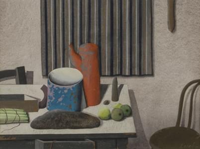 Pot bleu, cafetière et pommes vertes, gouache et aquarelle 18x23...
