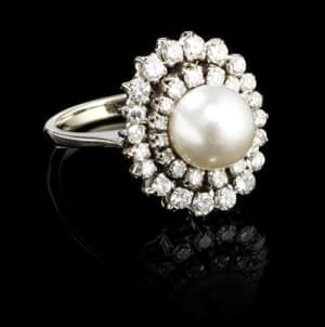305. Bague centrée d'une perle (D env. 9 mm) entourée de diamants (en...