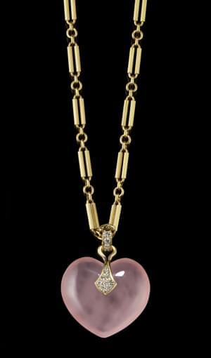 337. Sautoir à maille ovale fantaisie retenant un cœur en quartz rose