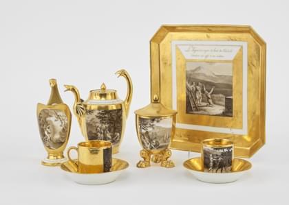 383. Tête-à-tête blanc et or à décor de scènes de tragédie en grisail...
