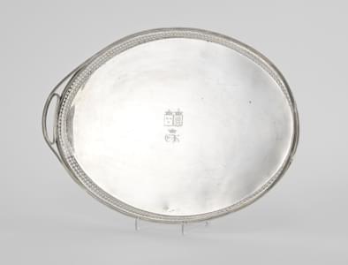 389. Plateau ovale à bordure ajourée et gravé d'armoiries d'alliance