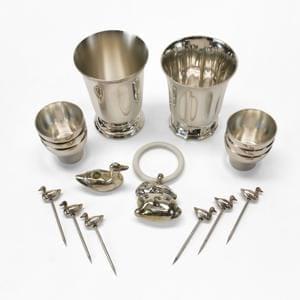 Métal argenté, comprenant: 2 timbales, 1 hochet lapin, 6 gobelet...