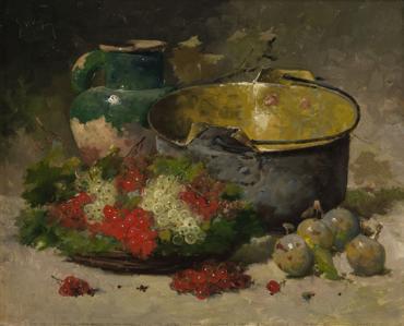 Nature morte au panier de fruits, huile sur toile, signée et dat...