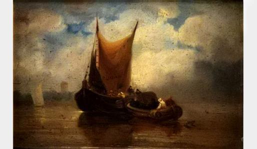 Marine, huile sur toile, signature E. Boudin apocryphe, 24x34 cm
