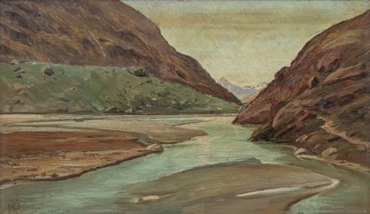 Vue du lac de Mattmark, huile sur panneau, signée et datée 1907,...