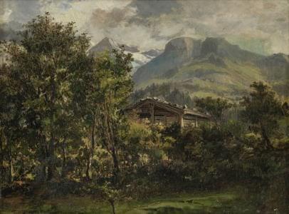 Chalet dans la montagne, huile sur panneau, 29x38 cm