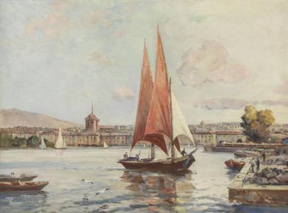 La rade de Genève, huile sur toile, signée, 54x73 cm
