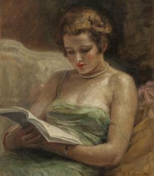 Femme à la lecture, huile sur toile, signée et datée 32, 44x38...