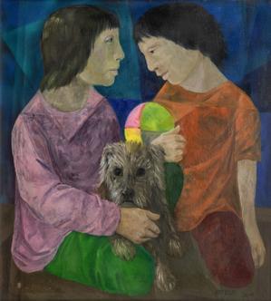 Portrait de deux enfants avec chien, acrylique sur toile, signée...