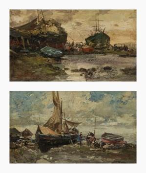 Retour de pêche, paire d'huiles sur carton, 15,5x26 cm