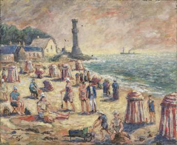 La plage de Honfleur, huile sur toile, signée, 65x80 cm