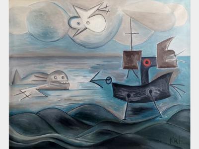 Le Baleinier, huile sur toile, signée, datée au dos 78-79, 60x73...