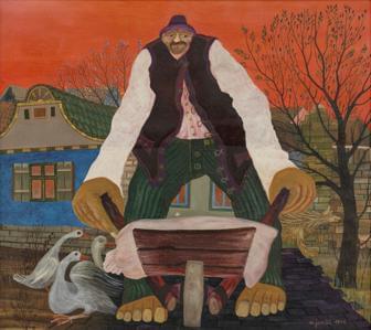 Paysan avec cariole, huile sur toile, signée et datée 1976, 39x5...
