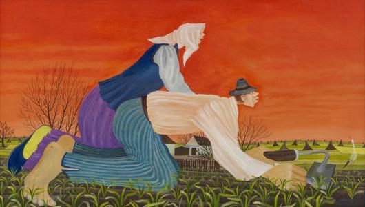 Paysans dans les champs, huile sur toile, signée et datée 1977,...