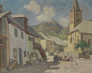 Place de Vallouise Hautes-Alpes, huile sur toile, signée, 65x81...
