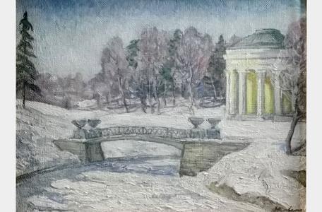 Scène d'hiver, park Pavlosk avec pavillon, huile sur toile, sign...