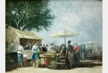 Scène de marché, huile sur isorel, 41x33 cm