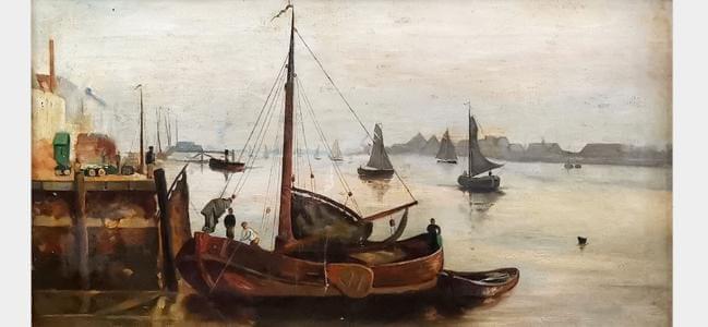 Scène de port, huile sur toile, signature illisible, 50x65 cm