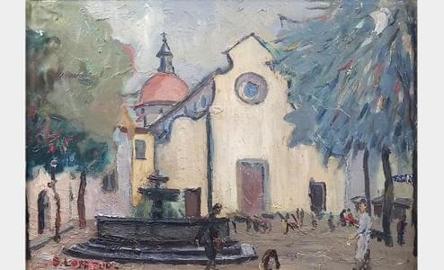 Place avec une église, huile sur carton, signée, 36x50 cm