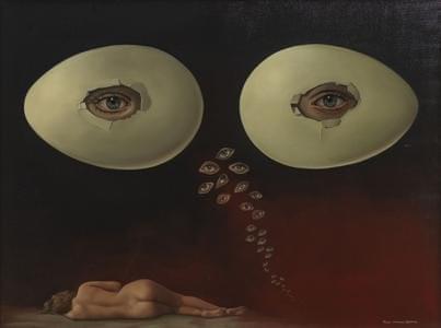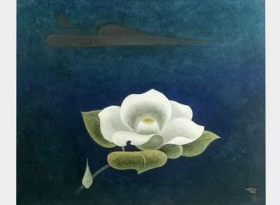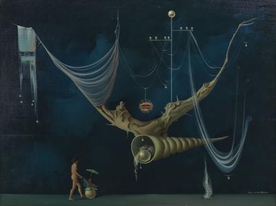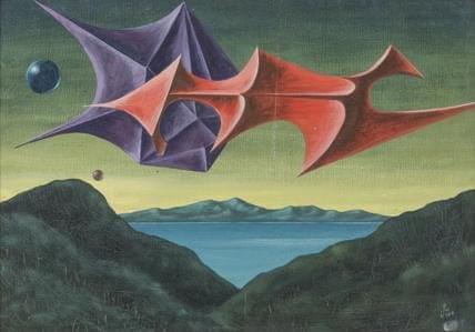 Vue du lac surréaliste, huile sur toile, signée et datée 1974, 6...