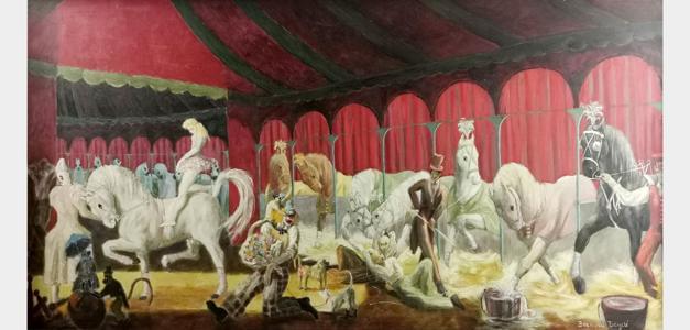Le cirque, huile sur panneau, signée, 58x118 cm