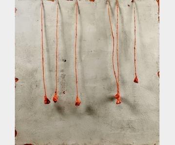 Sans titre, fils oranges sur fond blanc, technique mixte, 57x57...