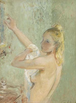 Femme blonde à sa toilette, pastel et gouache sur carton, 48x35...