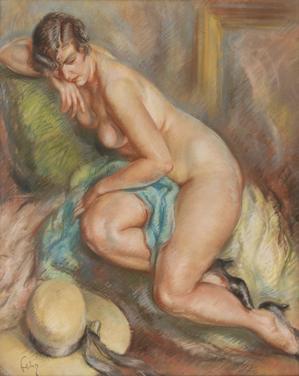 Femme nue remontant son bas, pastel sur papier, 56x43 cm