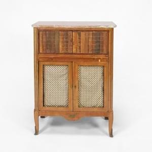 Placage de bois fruitier, marbre blanc à galerie, 110x70x 47 cm