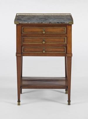 Trois tiroirs, acajou, marbre gris à galerie, 70x46x32 cm