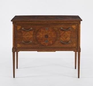 Deux tiroirs, marqueterie de bois fruitiers, 95x111x54 cm