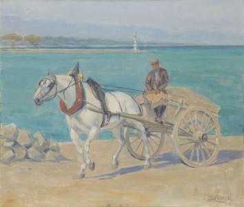 Cheval de trait avec la jetée des Pâquis en fond, huile sur cart...
