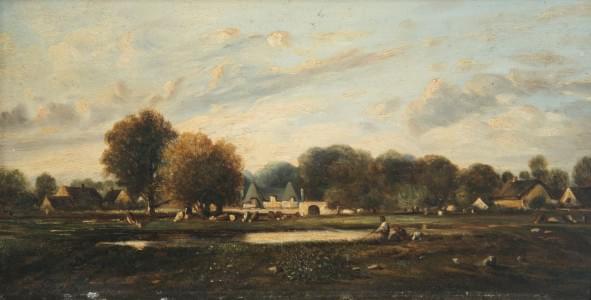 Paysage lacustre, huile sur carton signée, 24x31,5 cm