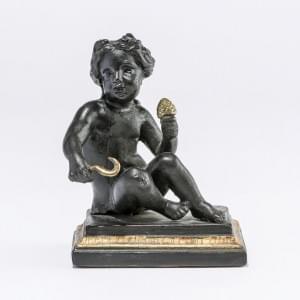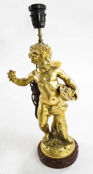 Putto au panier de fleurs, régule à patine or, signé, monté en l...