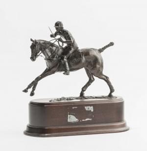 Jockey à cheval, bronze à patine brune, signé et daté 85, 30x36...