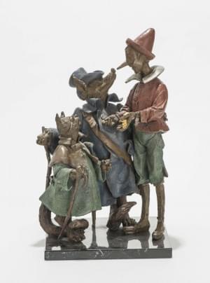 Pinocchio et deux acolytes, bronze à patine colorée, signé, H 40...