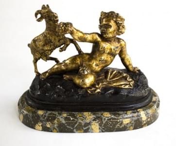 Groupe en régule à patine or, socle en faux marbre, 15x19x8 cm