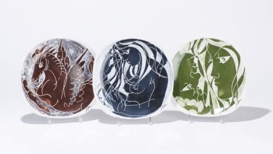 Trois assiettes, porcelaine à décor imprimé figurant Pégas, Siby...
