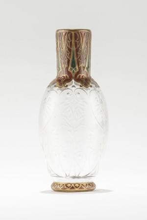 Petit vase à col étroit, verre gravé et verre émaillé rouge et v...