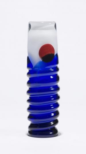 Vase tubulaire, verre souffle teinté rouge, bleu et blanc, signé...