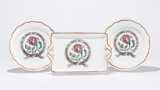 3690. Paire d'assiettes et un plateau rectangulaire à décor de roses e...