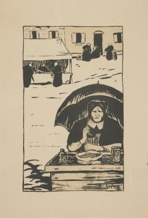 La marchande au parapluie, gravure sur bois, signée dans la plan...