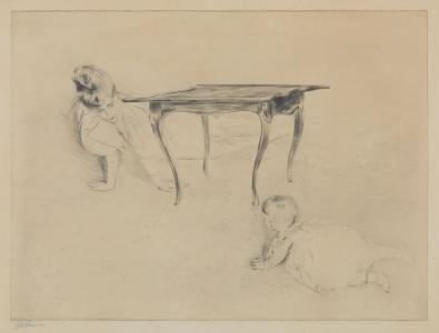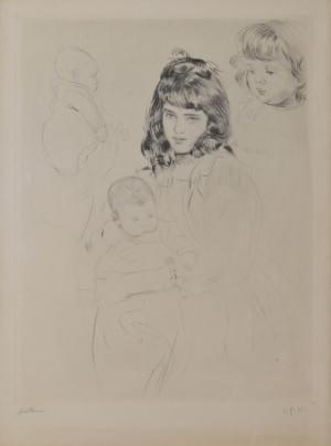 Mère et enfant jouant, pointe sèche sur papier signée, 30x40 cm