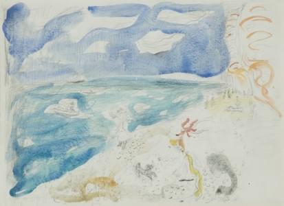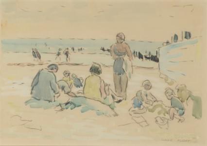 Scène de plage, aquarelle et fusain sur papier, 37x53 cm