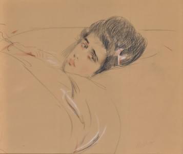 Jeune femme alitée, mine de plomb, sanguine et craie blanche sur...