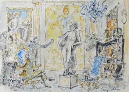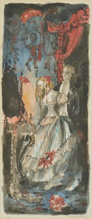 Soir de fête, lavis d'encre sur papier, monogrammé, 25x20 cm
