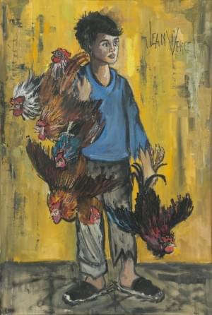 Jeune garçon au coq, grande gouache sur papier, 110x74 cm