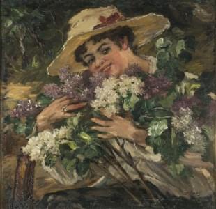Jeune femme au bouquet de fleurs, huile sur carton, signée, 67x6...