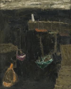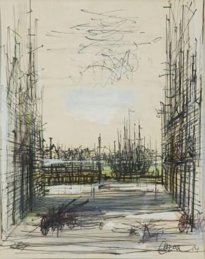 Le port, encre et gouache sur papier signée et datée 54, 29x24 c...