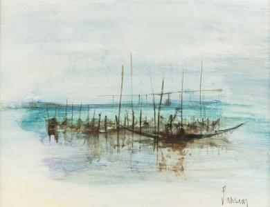 Gondoles dans la lagune, huile sur toile signée, 50x65 cm